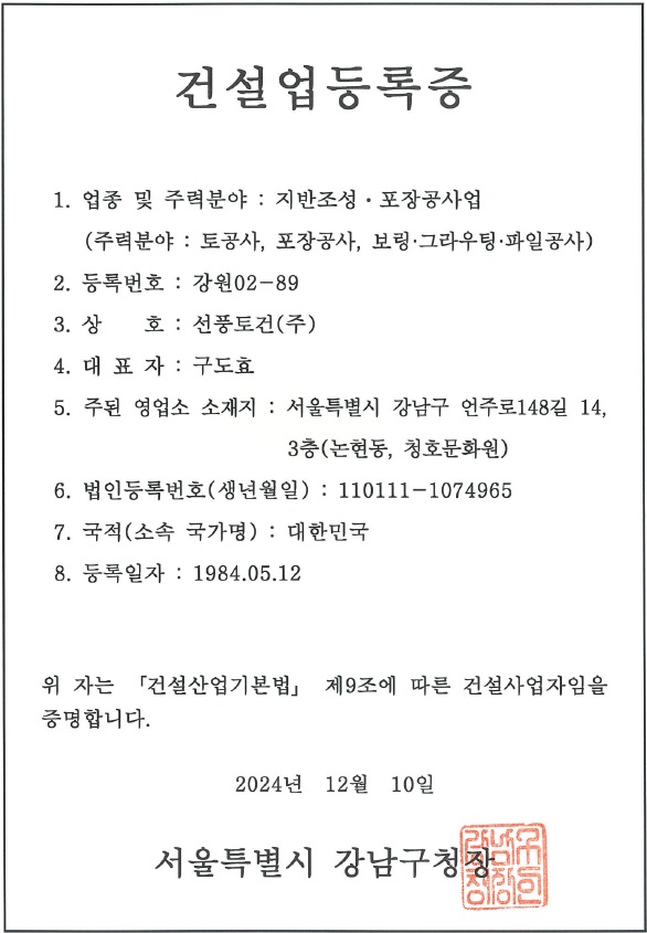 건설업등록증 - 지반조성 · 포장공사업