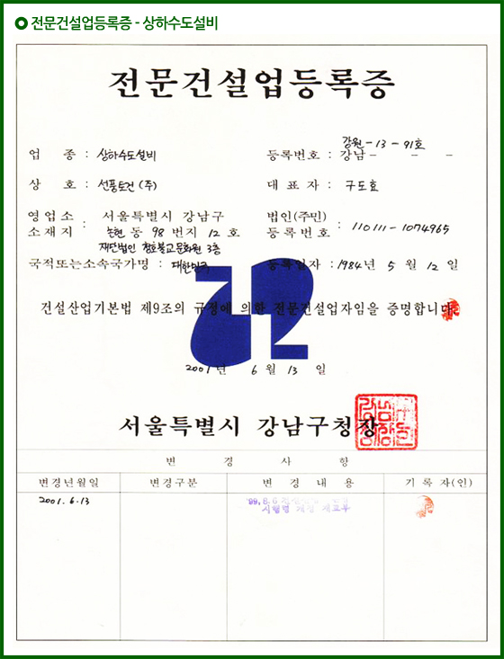 전문건설업등록증 - 상하수도설비