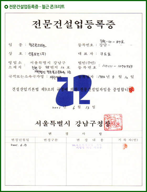 전문건설업등록증 - 철근 콘크리트